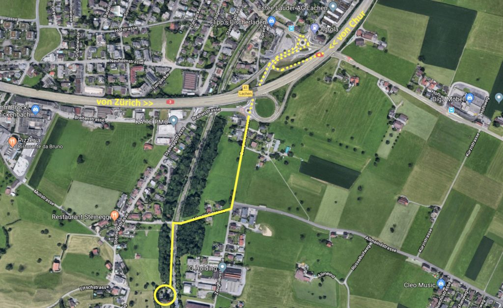 Die Schiessanlage Steinegg befindet sich direkt neben dem Spreitenbach an der Grenze von Lachen und Altendorf. Die Anfahrt ist ab dem Kreisverkehr (Autbahnausfahrt Lachen) ausgeschildert.